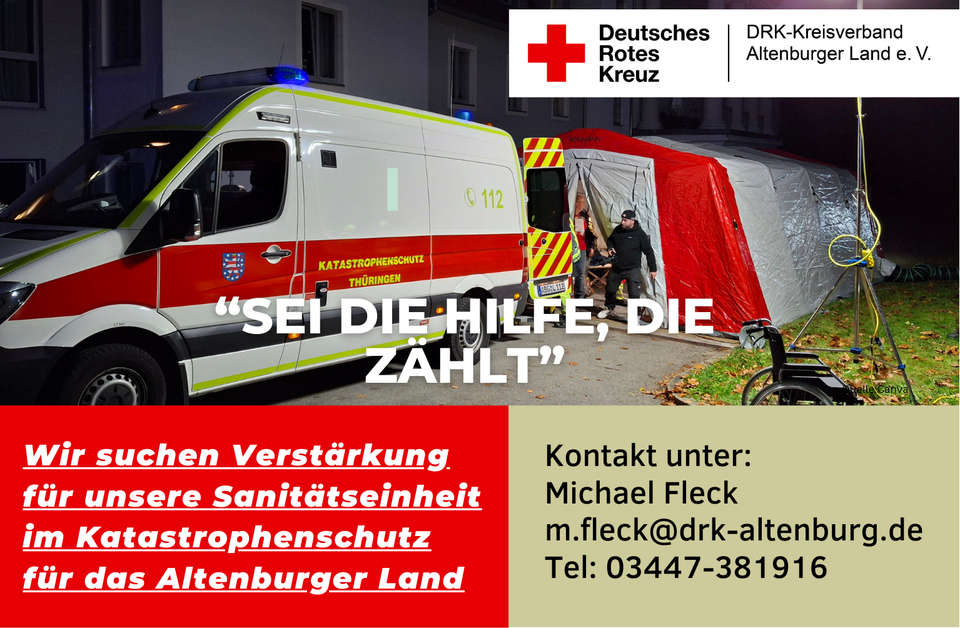 Wir suchen Verstärkung für unsere Sanitätseinheit im Katastrophenschutz für das Altenburger Land und freuen uns auf Dich!